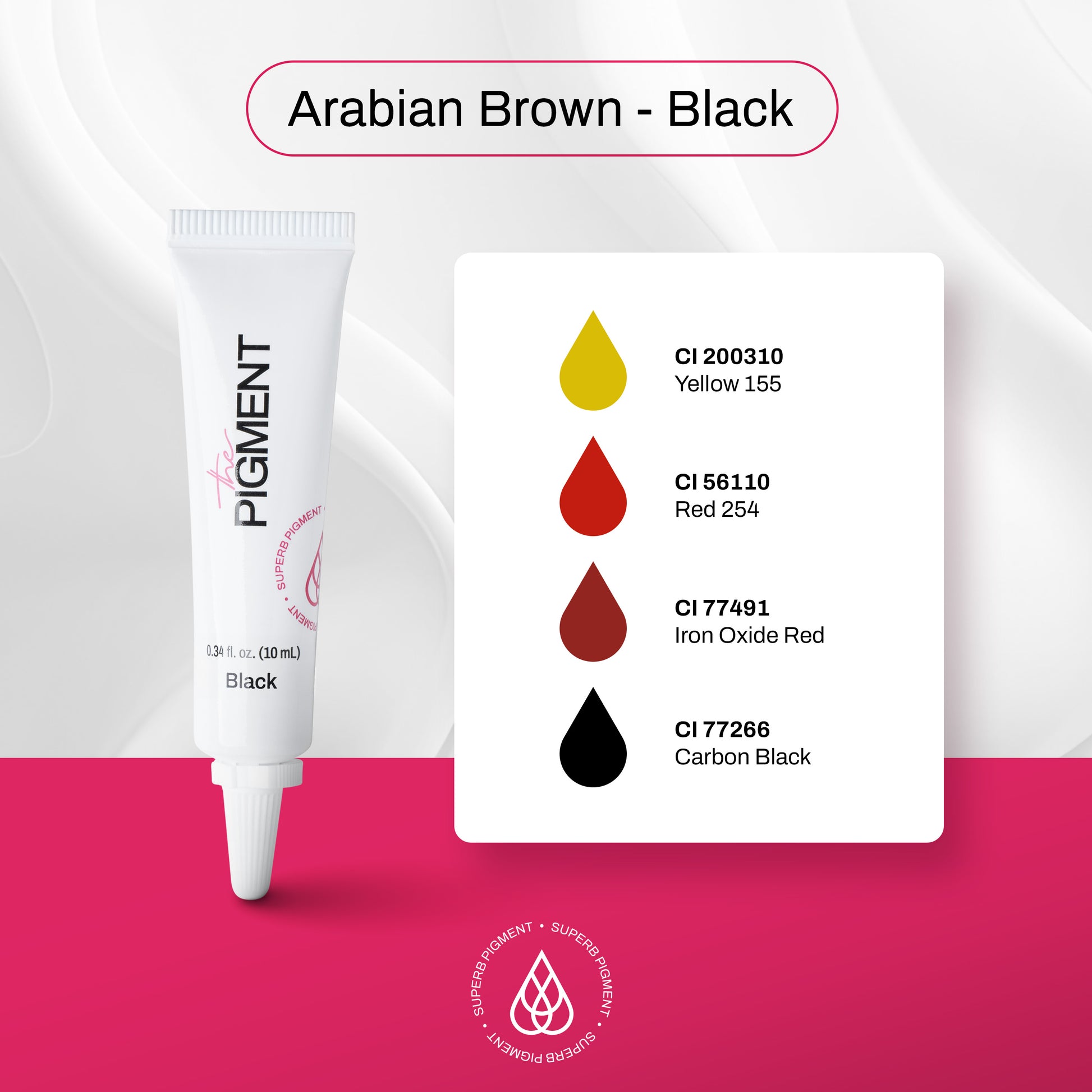 Arabian Brown - Blackは、ダークスキン、濃い眉、ダークヘアを持つお客様のために特別に開発されたクールトーンのハイブリッド色素です。クールなベースカラーが、不要な赤みを抑えつつ、美しく深みのある仕上がりを実現します。