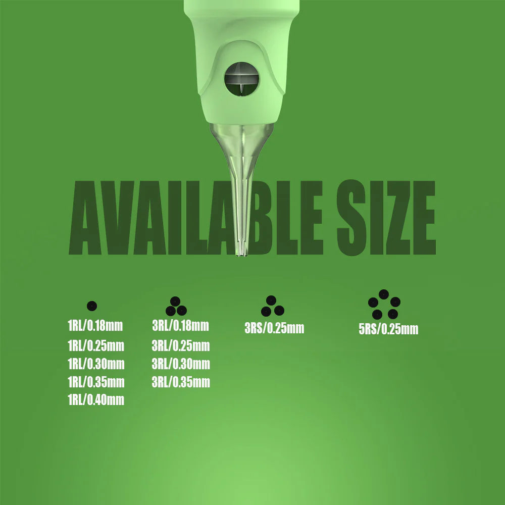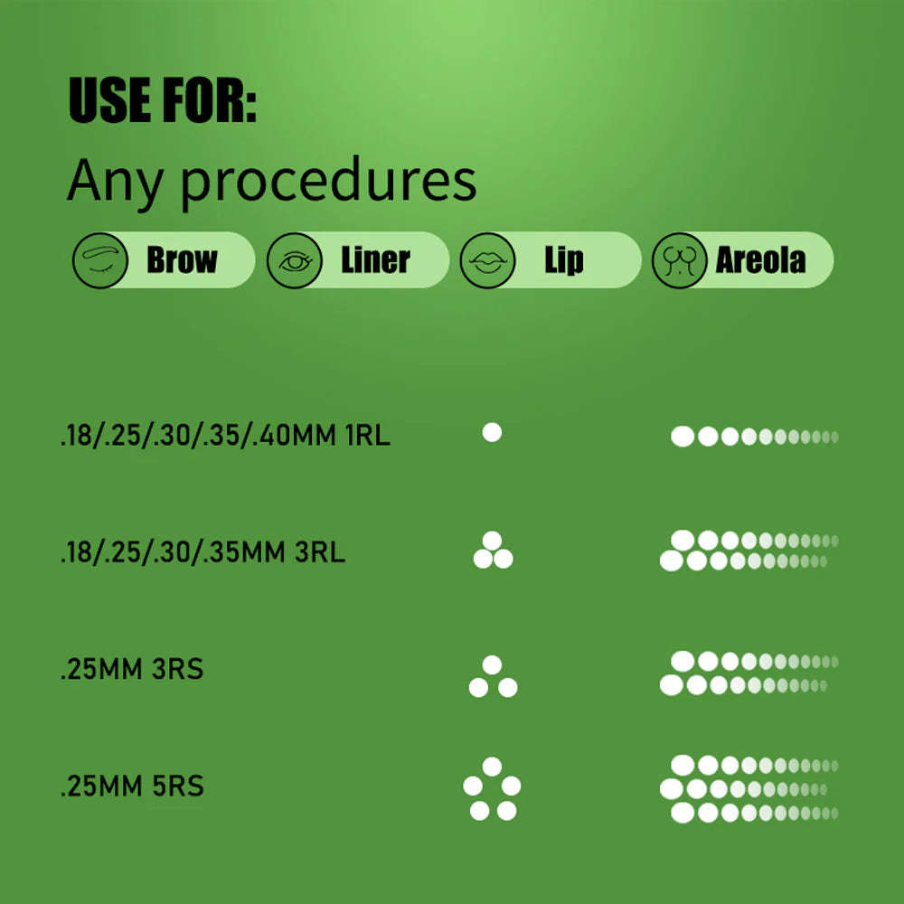 多数の人気マシンと互換性あり。治癒後も美しい仕上がりと高い色素定着率を実現。ニードルのテーパー角を最適化し、皮膚へのダメージを抑えながら色素を効率的に注入。 -